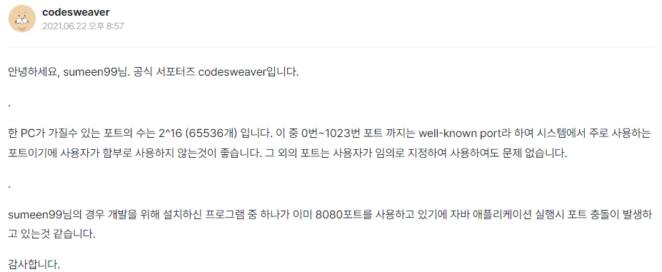 다른 프로젝트가 실행 중이었기 때문에, 8080포트를 이미 사용하고 있어서 에러가 발생했다.