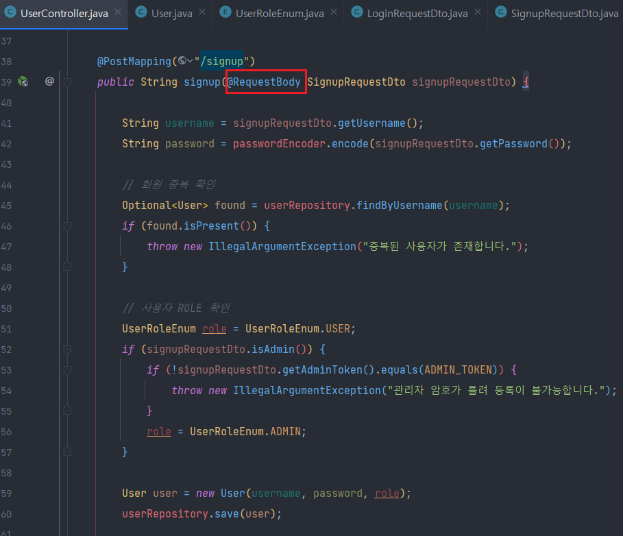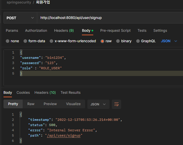 아래와 같은 에러로그를 나타내며 회원가입 postman에서 500에러가 났다.