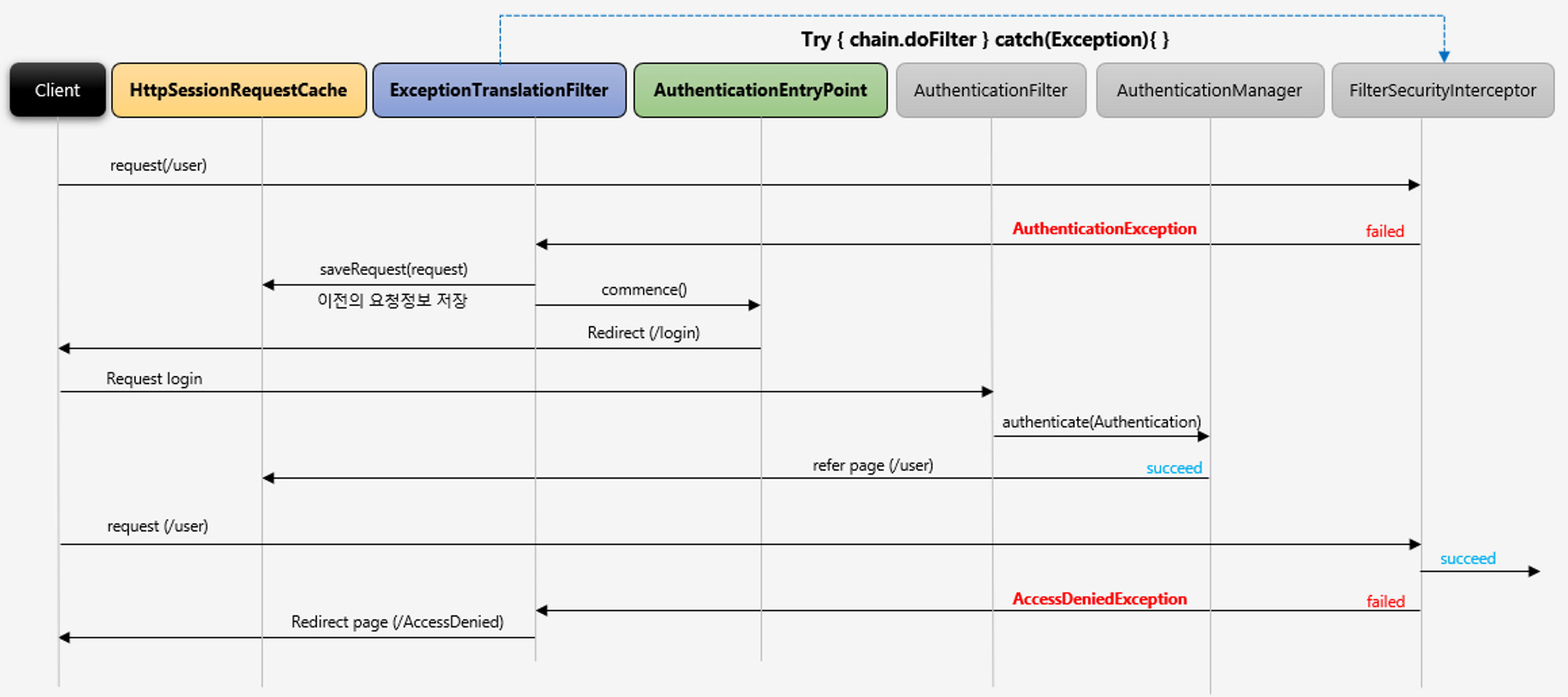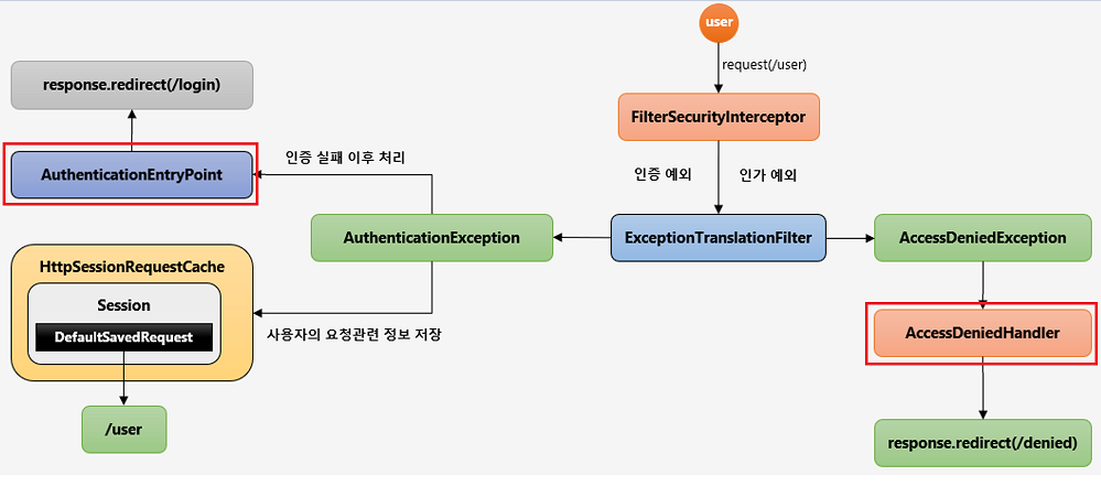 b. 예외 발생 이전에 유저가 가고자 했던 요청정보를 DefaultSavedRequest객체에 저장하고 해당 객체는 Session에 저장되고 Session 에 저장하는 역할을 HttpSessionRequestCache에서 해준다.