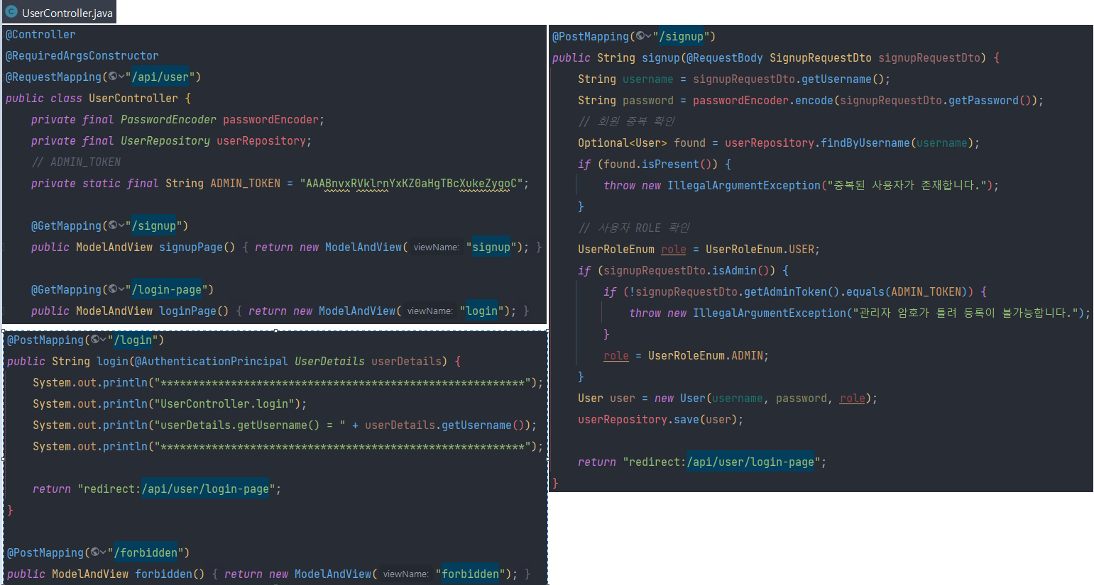 a . 해당 URI 요청은 permitAll 처리하고 사용자의 입력값으로 service에서 회원가입을 진행한다.