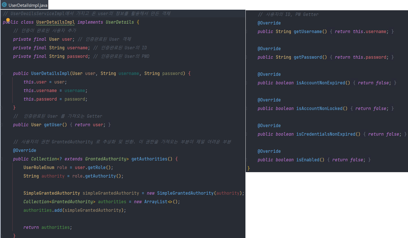 - authorities : 사용자에게 부여한 권한을 GrantedAuthority 로 추상화하여 사용한다.