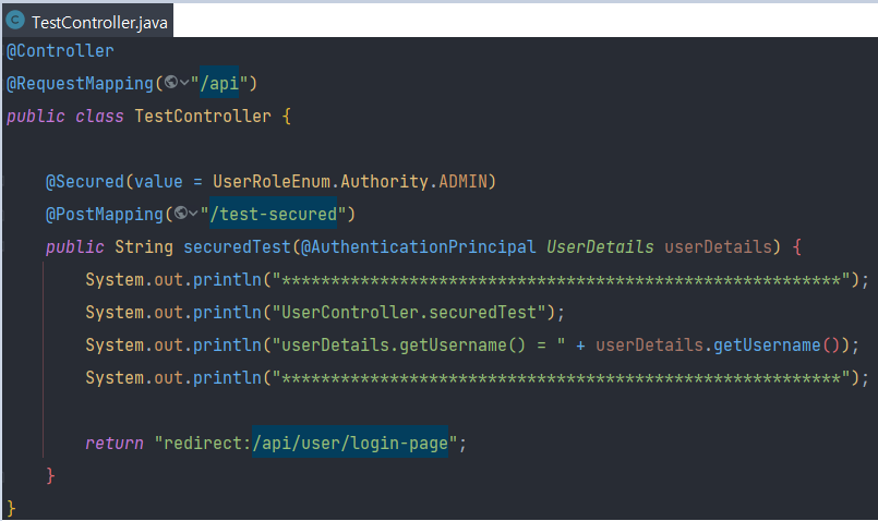 - principal : 사용자를 식별한다. Username/Password 방식으로 인증할 때 보통 UserDetails 인스턴스다.
