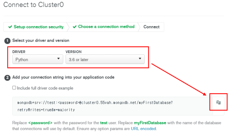 2. 나의 연결 코드 복사하기 : mongoDB Atlas 화면에서 Connect your application → Select your and version에 python, 3.6 or later 선택 → ②application code 우측에 복사버튼클릭