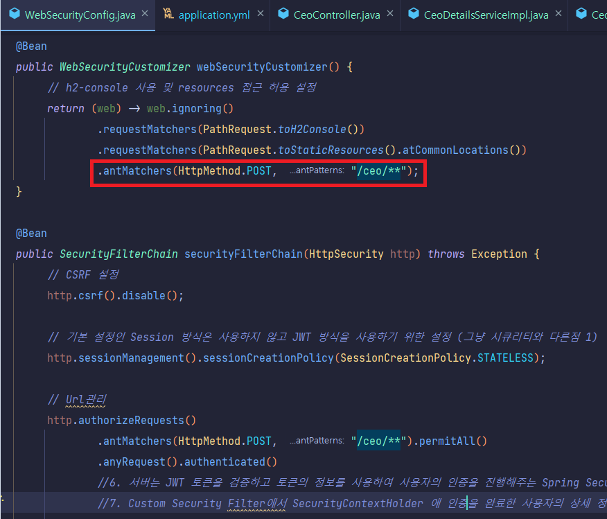 WebSecurityCustomizer에 .antMatchers(HttpMethod.POST, "/ceo/**"); 를 추가하여 해결하였다.