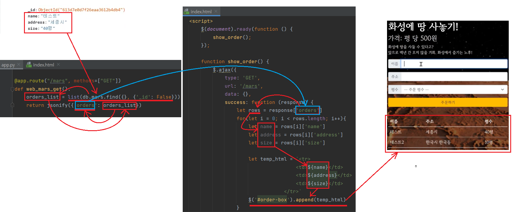| <서버만들기> @app.route("/mars", methods=["GET"]) def web_mars_get(): orders_list = list(db.mars.find({}, {'_id': False})) return jsonify({'orders': orders_list}) orders_list 는 여기서만 두번 쓰이고 끝나는 변수. orders는 중간다리 변수. |