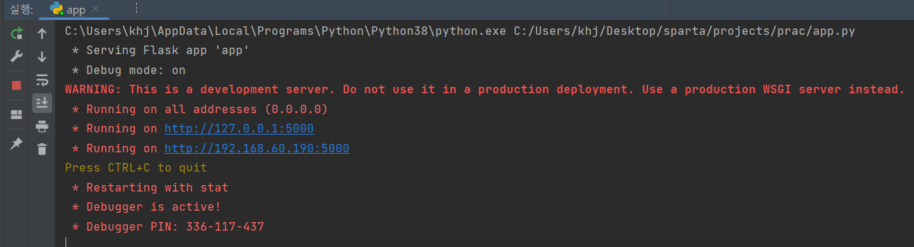 #debug=True라고 명시하면 해당 파일의 코드를 수정할 때마다 Flask가 변경된 것을 인식하고 다시 시작한다. 코딩시 내용을 바로 반영해서 결과를 확인하기 편하다.