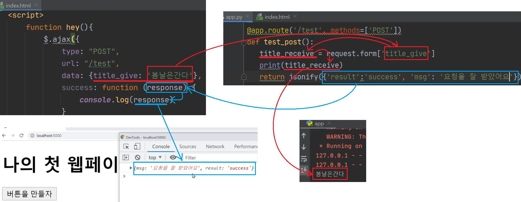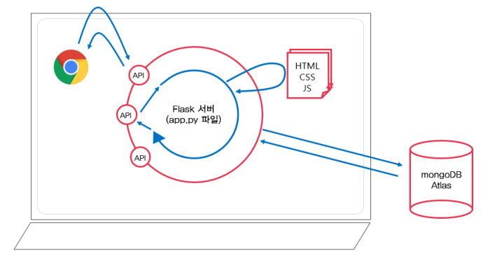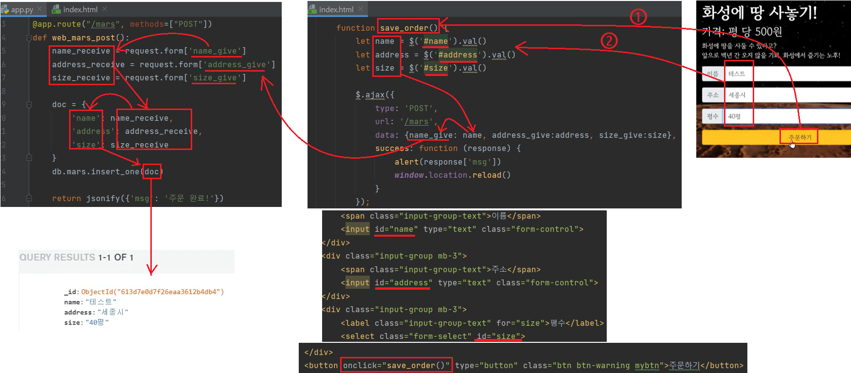 | <서버만들기> #app.py 파일에 flask, pymongo임포트 @app.route("/mars", methods=["POST"]) name_receive = request.form['name_give'] doc = { 'name': name_receive, } db.mars.insert_one(doc) return jsonify({'msg': '주문 완료!'}) name_give는 중간다리 변수. name_receive는 여기서만 두번 쓰이고 끝나는 변수. |
