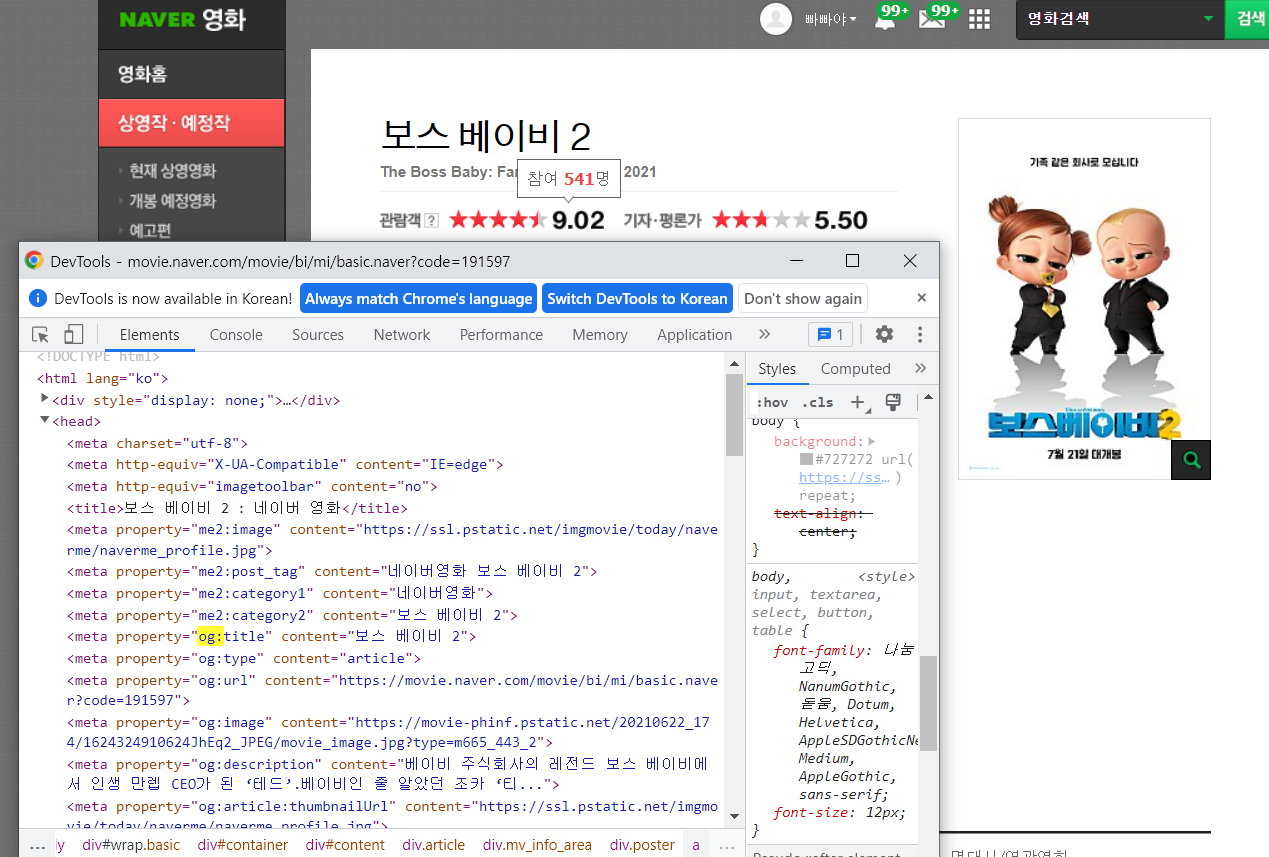 url = 'https://movie.naver.com/movie/bi/mi/basic.naver?code=191597'