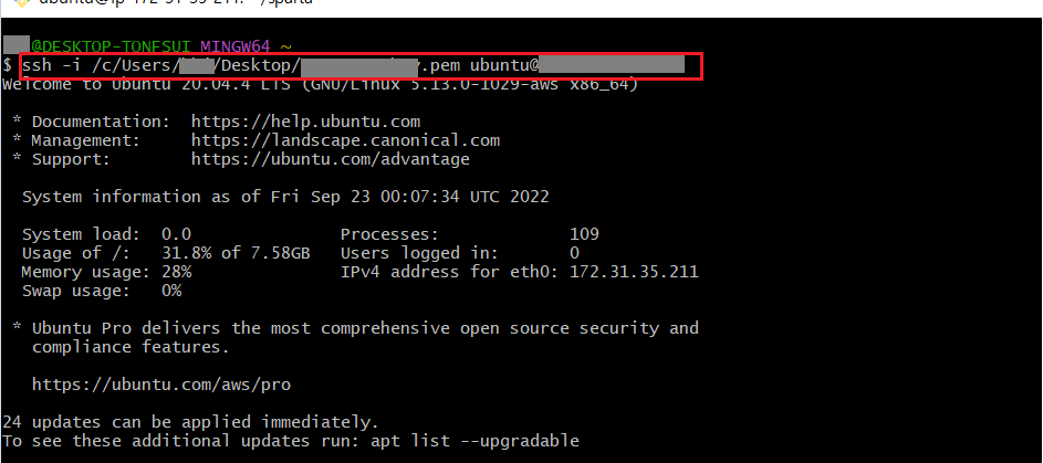 (ex. ssh -i /path/my-key-pair.pem ubuntu@13.125.250.20)