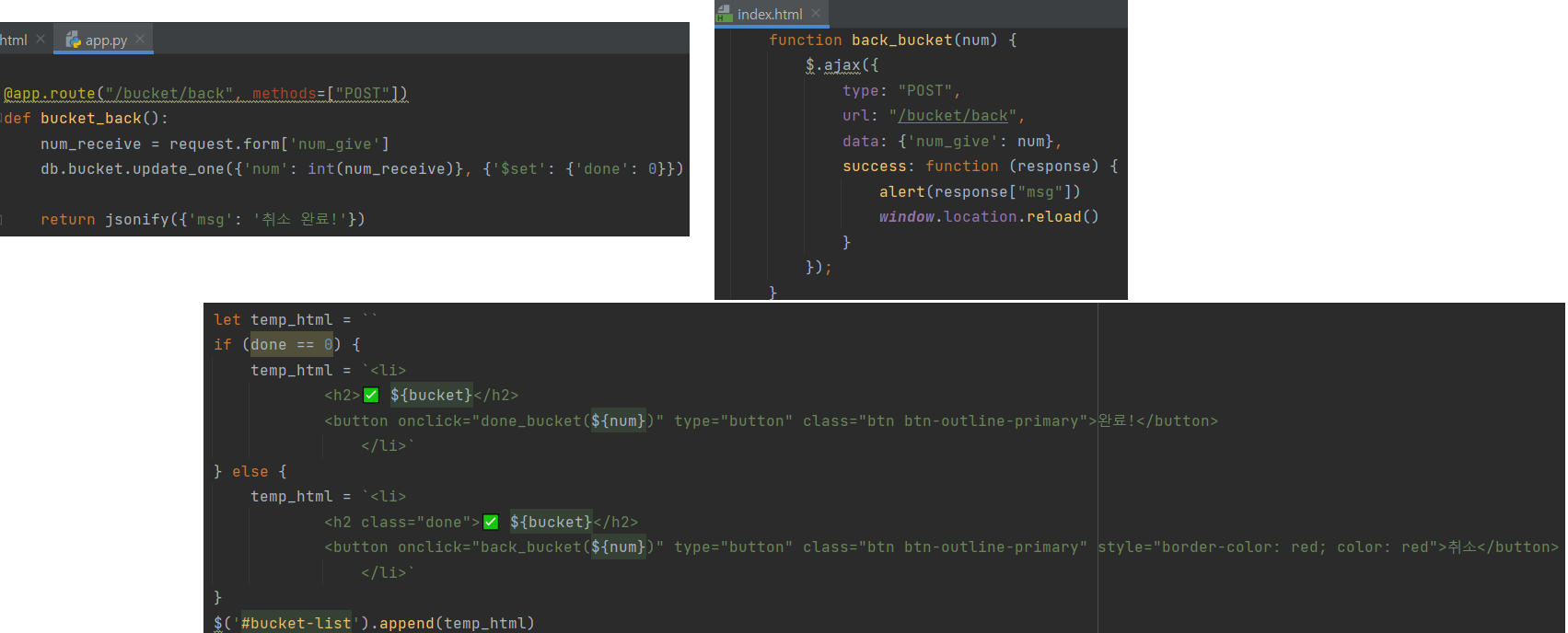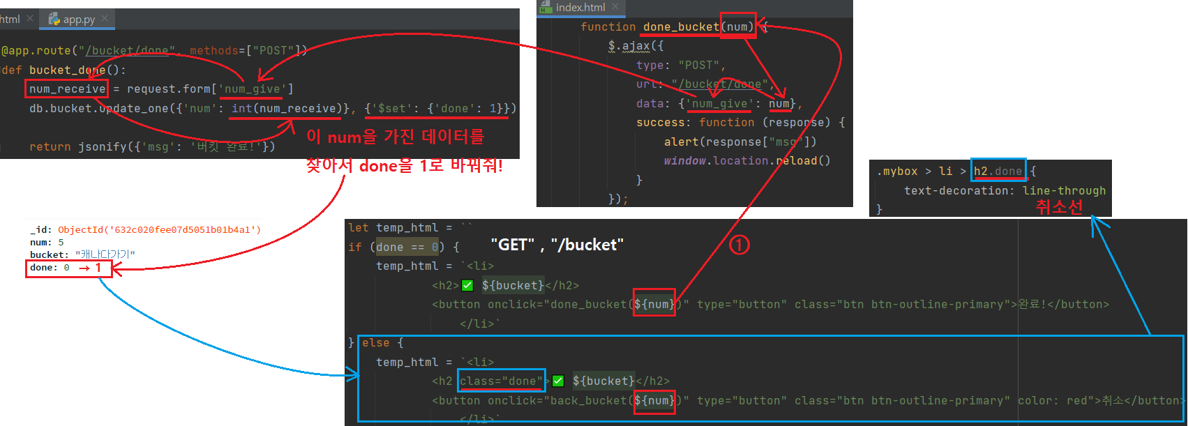 db.bucket.update_one({'num': int(num_receive)}, {'$set': {'done': 1}}) #⭐디비에서 이 number를 가진 버킷리스트를 찾아서 done값을 1로 수정해줘!