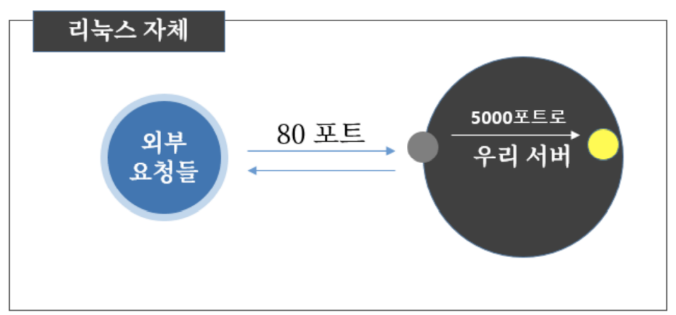 80포트로 오는 요청을 5000 포트로 전달하게 하는 포트포워딩 (port forwarding) 을 사용하자!