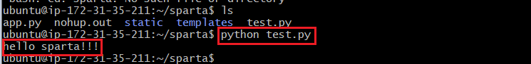 이렇게 서버 컴퓨터를 열어주고, 내가 만든 폴더(sparta)클릭 후, 왼쪽에서 실행할 파일(test.py)를 오른쪽으로 끌어다 놓으면 업로드 끝!