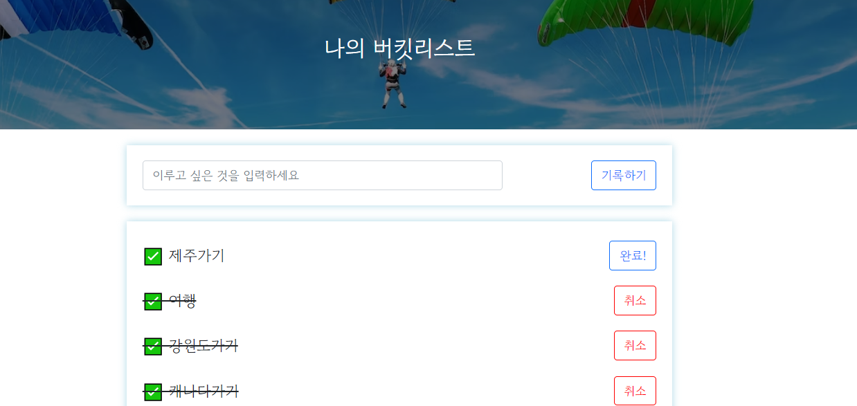 - 버킷리스트 목록을 기록하고, 완료 버튼을 누르면 취소선이 그어지도록 만들어 보자!