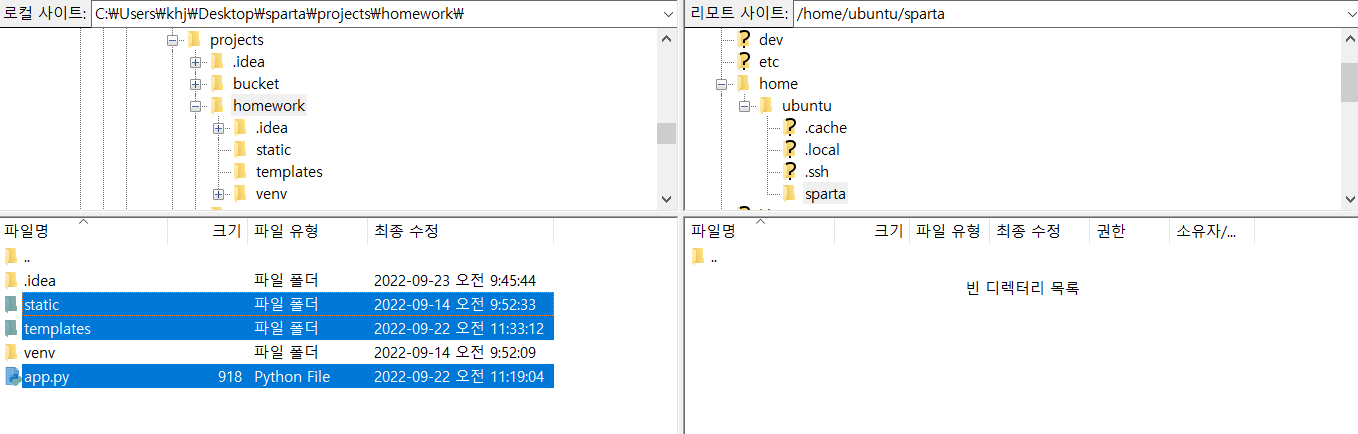 homework 폴더안의 static, templates폴더, app.py파일을 EC2인스턴스의 sparta폴더에 드래그 앤 드롭 한다.
