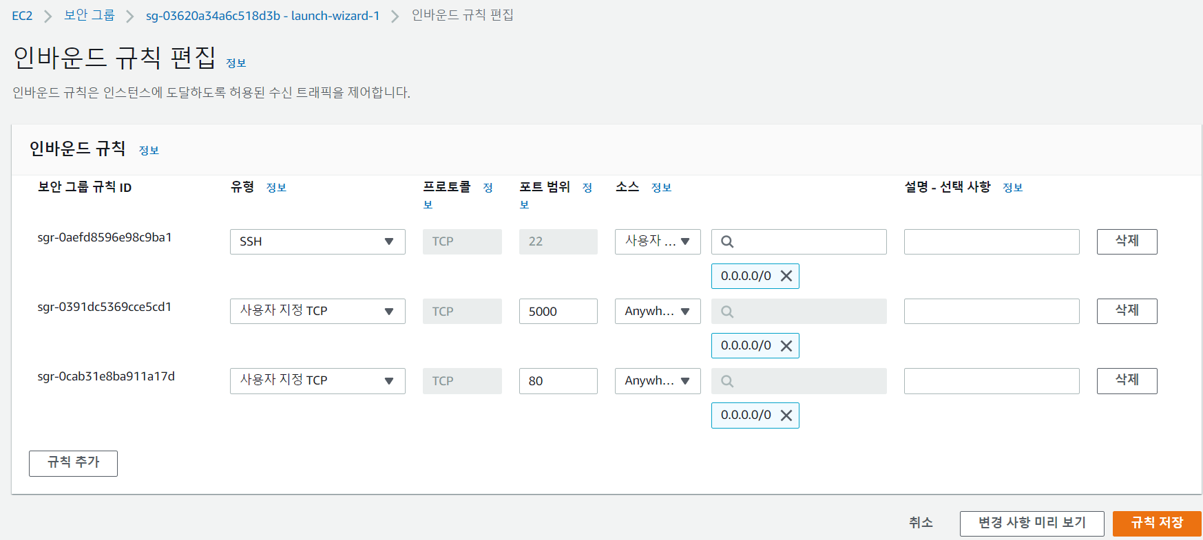 두 가지 포트를 추가(5000포트: flask 기본포트 / 80포트: HTTP 접속을 위한 기본포트) - Anywhere-IPv4 로 규칙저장!