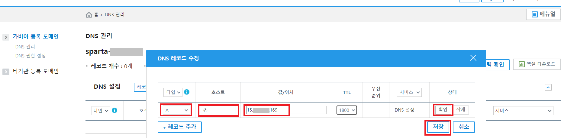 DNS관리 - DNS설정 - 호스트 이름에 @, IP주소에 IP주소를 입력!