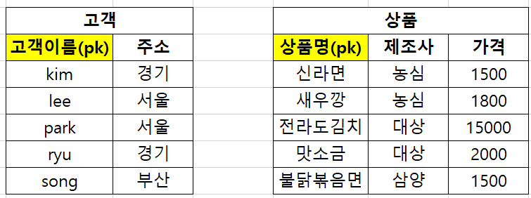 물론 pk 로는 고객이름, 상품명 보다는 고객id , 상품id로 작성해주는 것이 좋지만 이해가 쉽도록 위와같이 작성하였다.