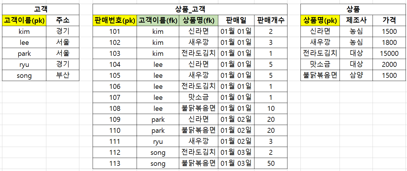 이렇게 두 테이블 사이에 '상품_고객' 테이블을 넣어주니, 위의 문제점이 해결되었다!!