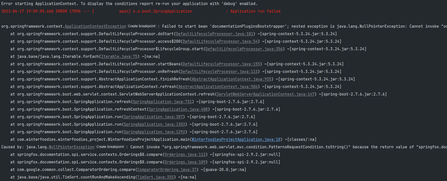 Caused by: java.lang.NullPointerException: Cannot invoke "org.springframework.web.servlet.mvc.condition.PatternsRequestCondition.toString()" because the return value of "springfox.documentation.spi.service.contexts.Orderings.patternsCondition(springfox.documentation.RequestHandler)" is null