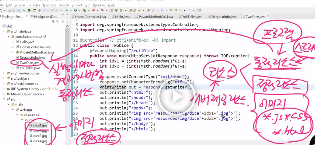 TwoDice클래스 생성하고, 깃허브에 dice.zip파일받아서 STS안에 다음경로로 폴더에 붙여넣어서 이미지파일 준비하기