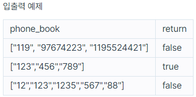 전화번호부에 적힌 전화번호를 담은 배열 phone_book 이 solution 함수의 매개변수로 주어질 때, 어떤 번호가 다른 번호의 접두어인 경우가 있으면 false를 그렇지 않으면 true를 return 하도록 solution 함수를 작성해주세요.