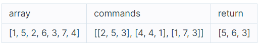 배열 array, [i, j, k]를 원소로 가진 2차원 배열 commands가 매개변수로 주어질 때, commands의 모든 원소에 대해 앞서 설명한 연산을 적용했을 때 나온 결과를 배열에 담아 return 하도록 solution 함수를 작성해주세요.