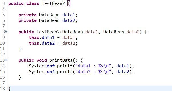 객체생성자주입은 Testbean2 bean안에 DataBean의 bean을 넣어준다. DataBean객체를 보고 Testbean2에 주입해준다.