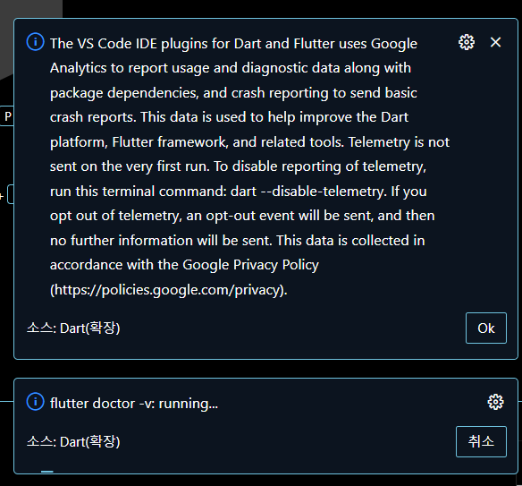 flutter 설치하면 dart도 자동으로 설치할거냐고 묻는다. 설치해주면 된다.