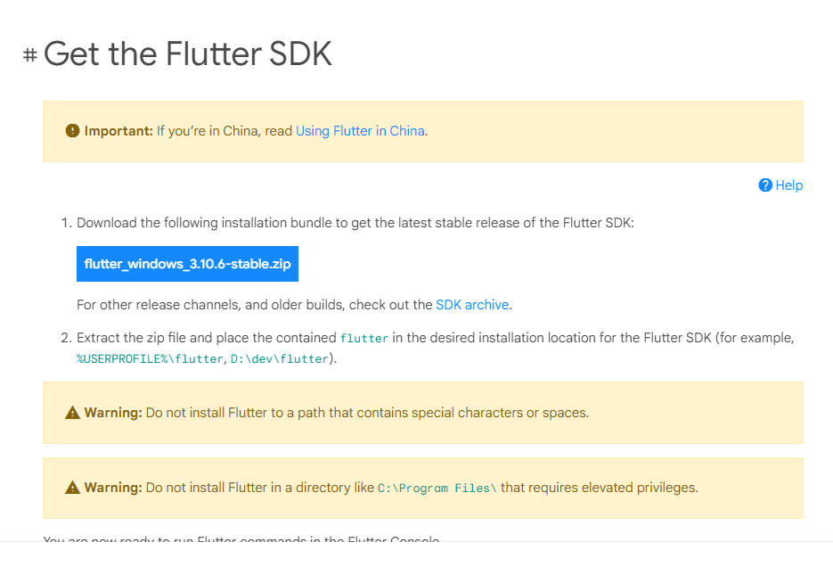 Flutter 개발환경 구축하기 1. 윈도우 플러터 개발 환경 구축 (1) 플러터 SDK 다운받기 아래의 플러터 홈페이지에 접속해 플러터 SDK를 다운받는다. https://docs.flutter.dev/get-started/install Install Install Flutte