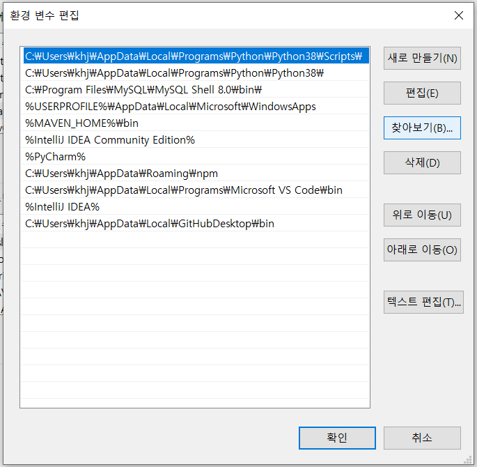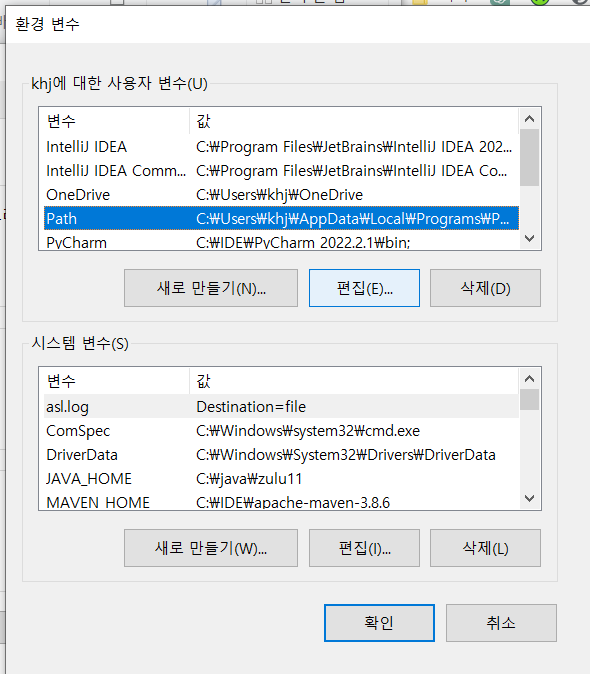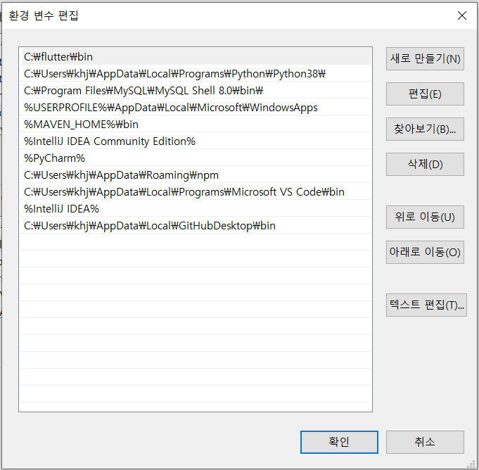 맨위에 환경변수가 잘 등록되었으면 연이어 확인클릭하고 환경변수 등록 완료!