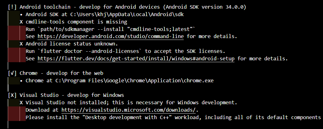 아래에서 두번째줄에 flutter doctor --android-licenses 를 실행시키라고 한다.