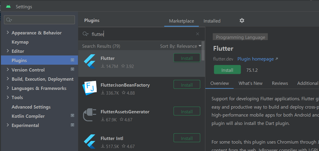 왼쪽에 확장 버튼 클릭 - Flutter 검색하여 설치