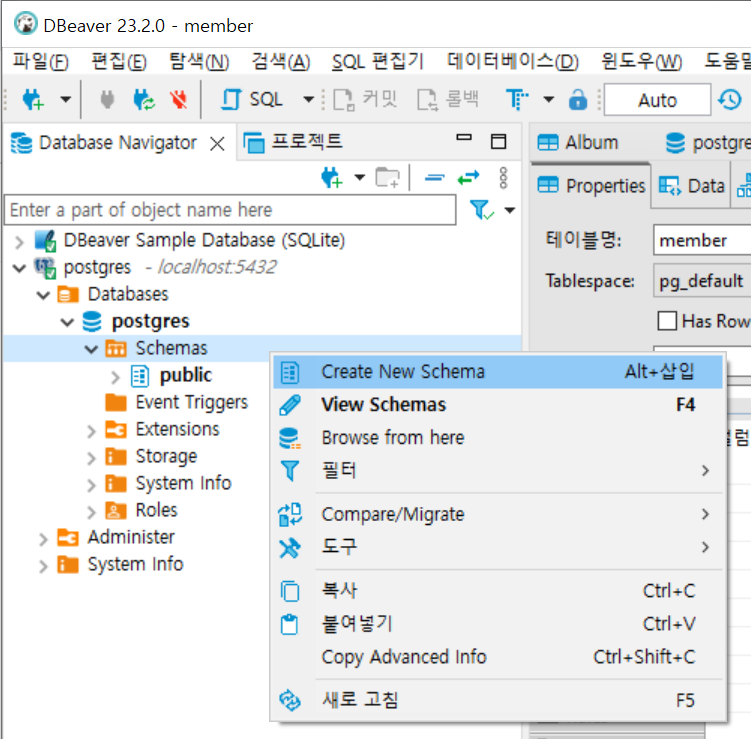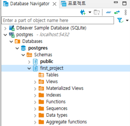 이렇게 해당 프로젝트의 명으로 스키마가 생성되었다.