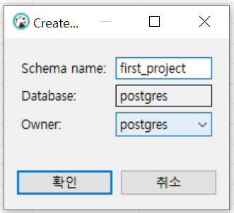 현재 프로젝트의 스키마를 생성해야한다. 프로젝트 명으로 스키마를 생성하자.