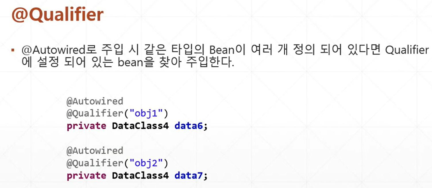 @Qualifier("빈이름") 으로 해당 빈을 찾아서 주입한다.