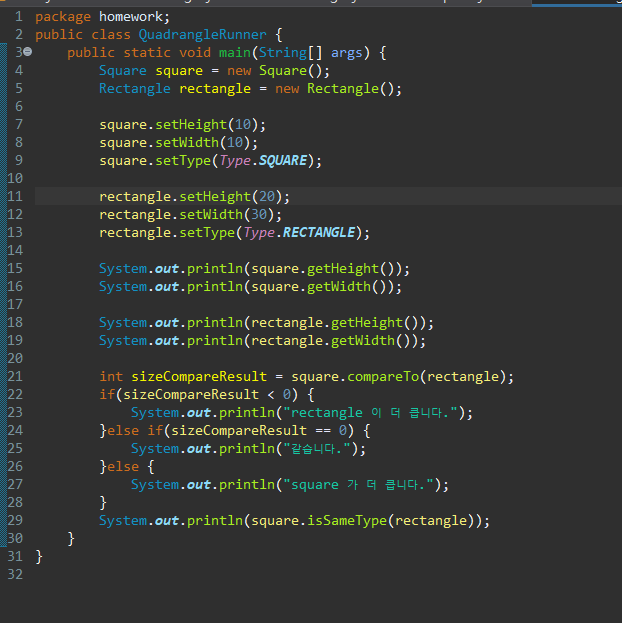 문제) enum(Type)도 포함하여 클래스 총 5개 작성하여(Quadrangle, Rectangle, Square, Type, Quadrangle) 아래 처럼 구현하기.