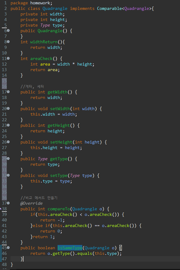 1. Quadrangle 클래스 작성 (compareTo 메서드와, 같은사각형인지 비교하는 boolean isSameType메서드도 작성)