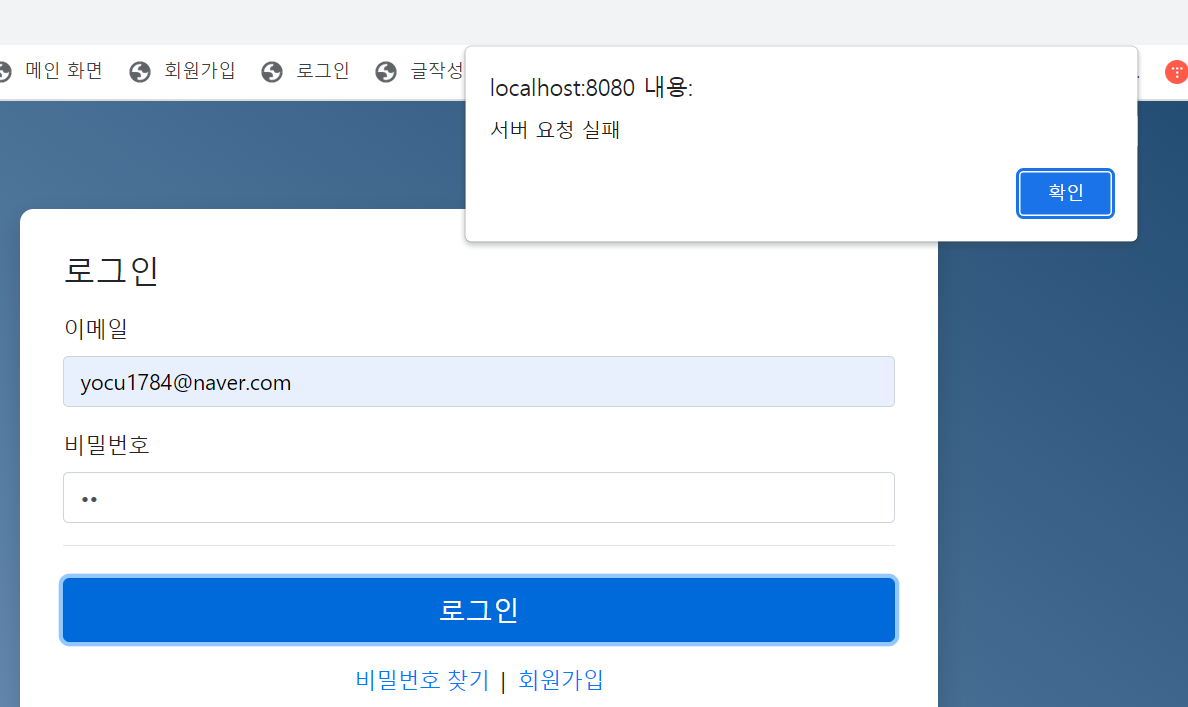 로그인 시 , 비밀번호를 다르게 작성했다.