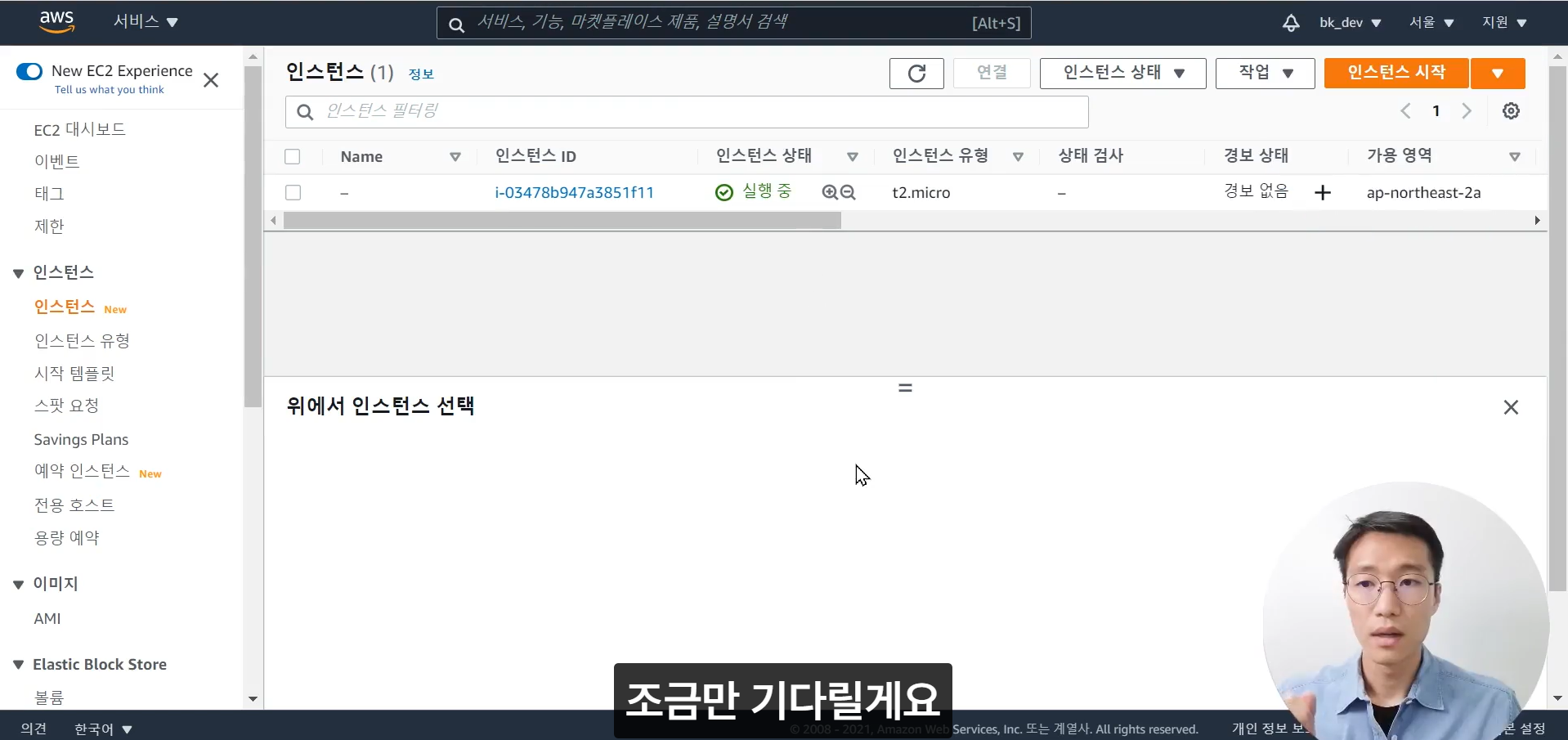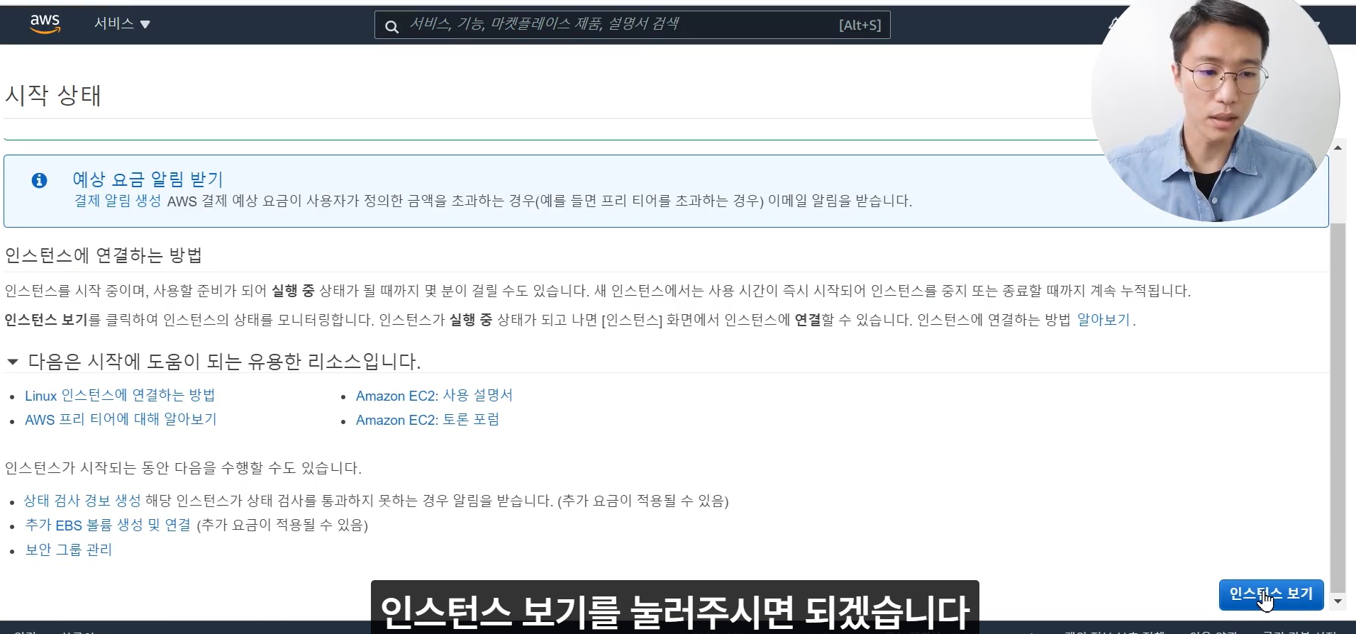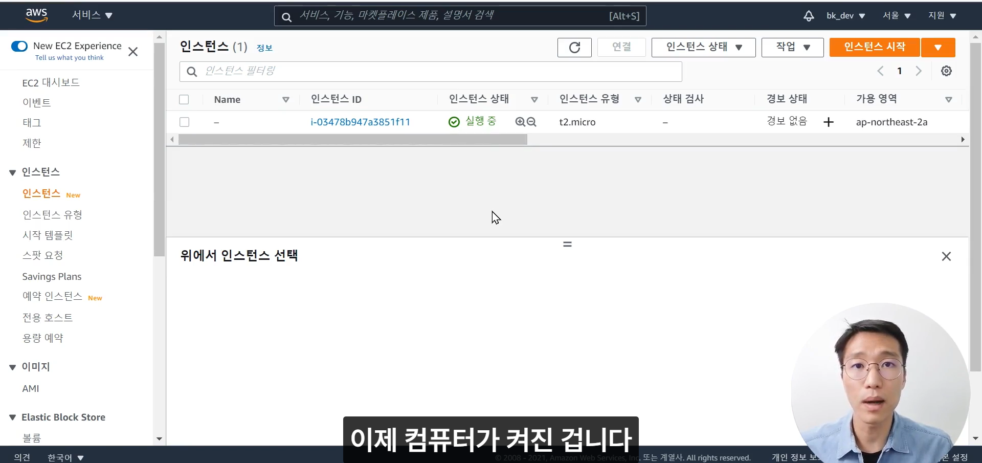 인스턴스 상태가 '실행 중' 으로 바뀌면 서버 컴퓨터가 켜졌다는 뜻이다.