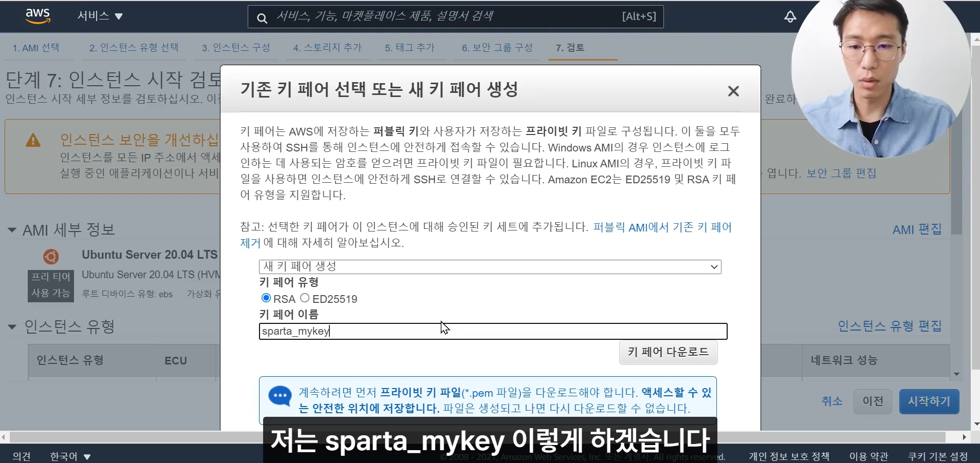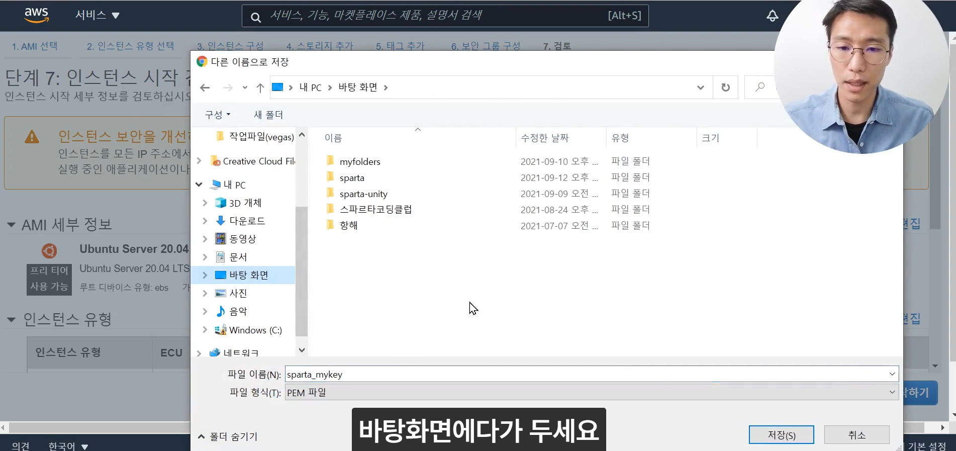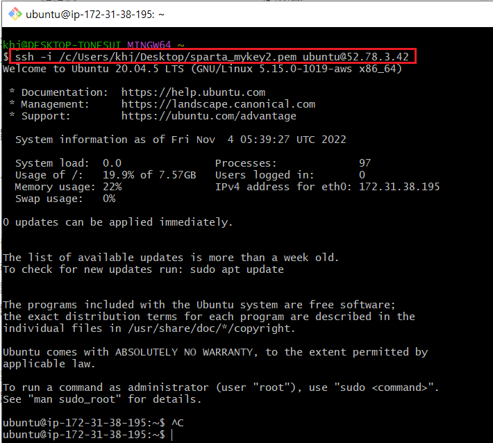 (실제입력 : ssh -i /c/Users/khj/Desktop/sparta_mykey2.pem ubuntu@52.78.3.42 )