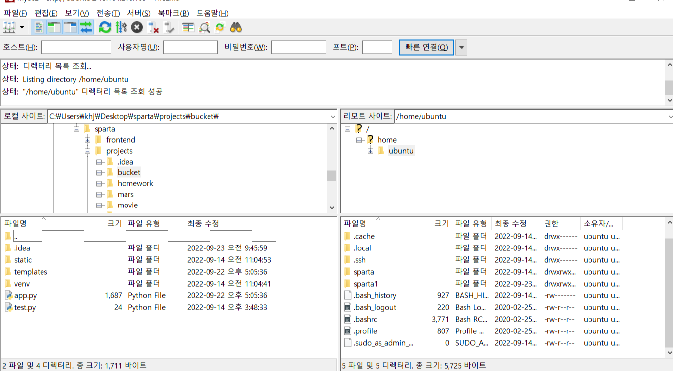 1) 파일질라에 내 아이피 정보 넣어서 서버 연결하기
