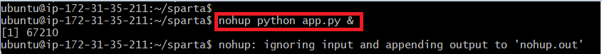 4. 다시 nohup 명령어 입력하여 서버 열어주기. ( gitbash에서 명령어 입력 --> nohup python app.py & )