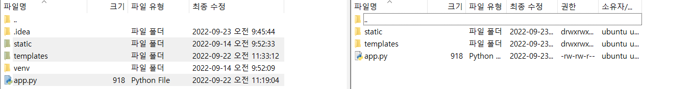 1) 파일질라에서 static, templates폴더, app.py파일 드래그앤드롭