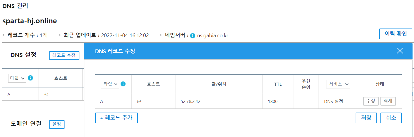 DNS관리 - DNS설정 - 호스트 이름에 @, IP주소에 IP주소를 입력!