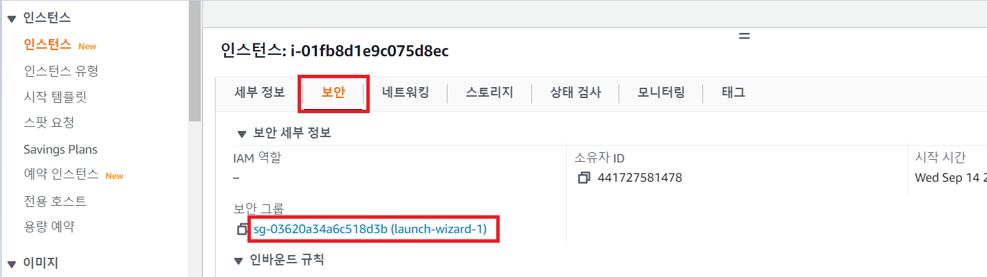 EC2 관리 콘솔 → 보안 탭 → 보안그룹의 링크 클릭 → 인바운드 규칙 편집 → 규칙추가 :