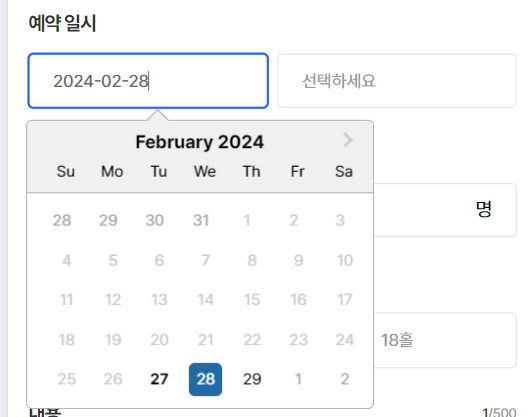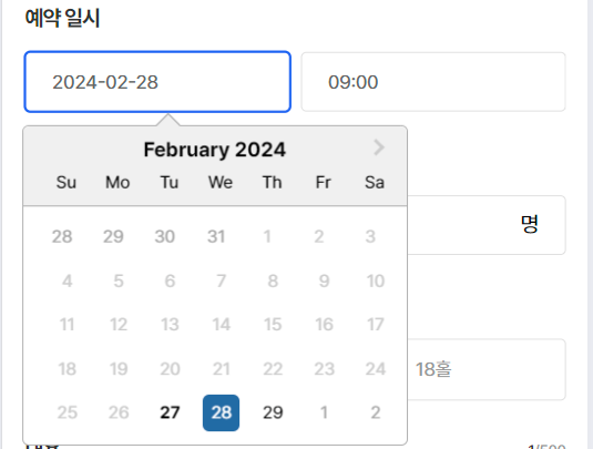 아래와 같이 모바일 화면 안에서 예약 일시에 datepicker 를 사용하여 입력받고 싶었다.