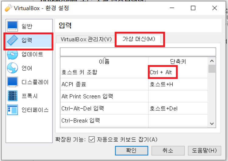 환경 설정 > 입력 > 가상머신 > 호스트 키 조합 'Ctrl + Art'
