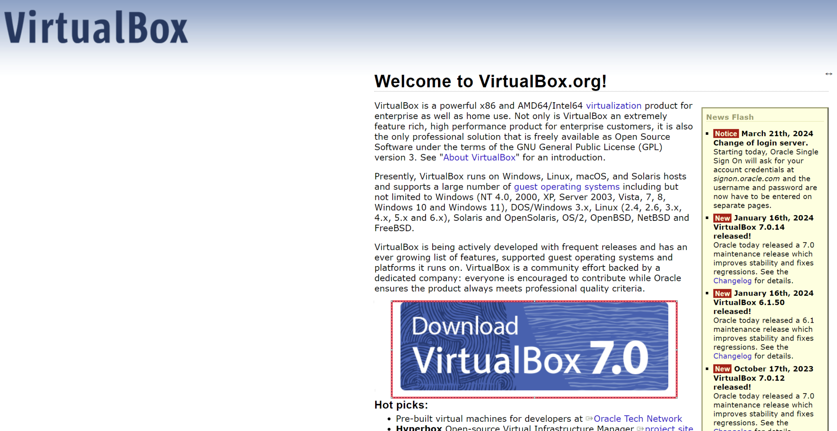 Welcome to VirtualBox.org! News Flash Notice March 21th, 2024Change of login server. Starting today, Oracle Single Sign On will ask for your account credentials at signon.oracle.com and the username and password are now have to be entered on separate pages