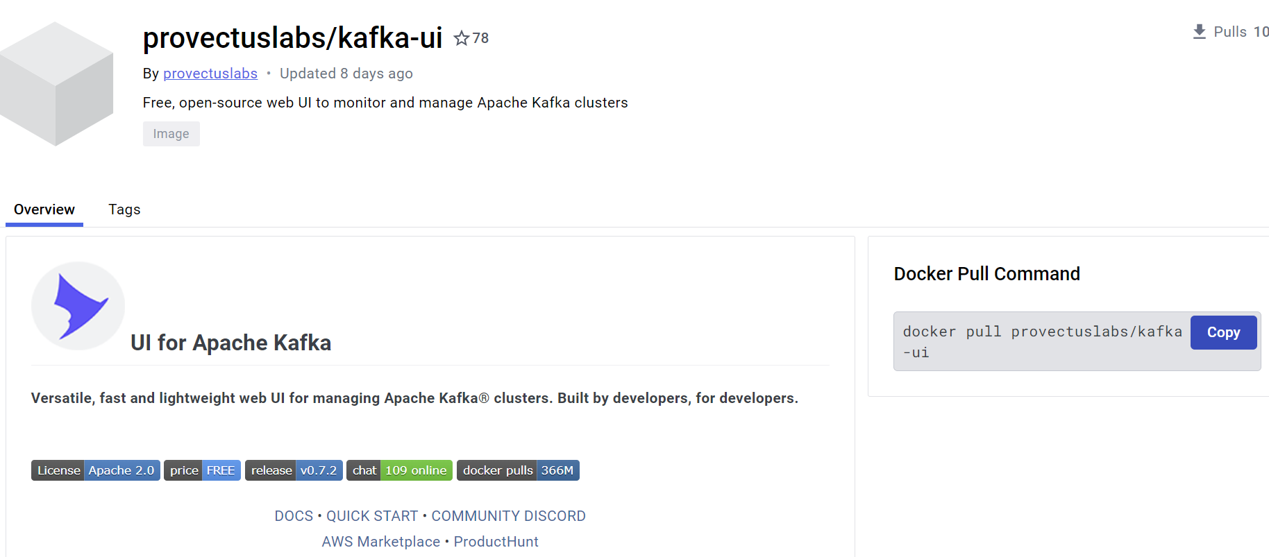 마찬가지로, 도커허브에서 제일 인기많은 카프카UI 를 내려받는다.