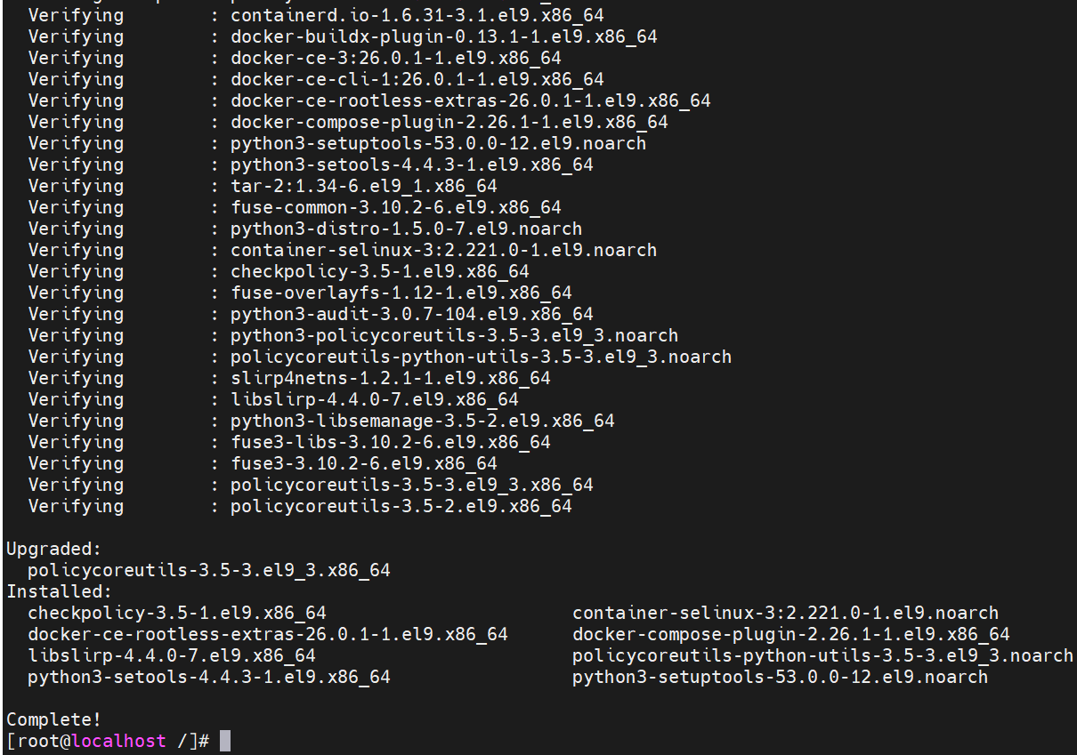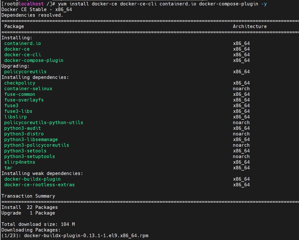 yum install docker-ce docker-ce-cli containerd.io docker-compose-plugin -y